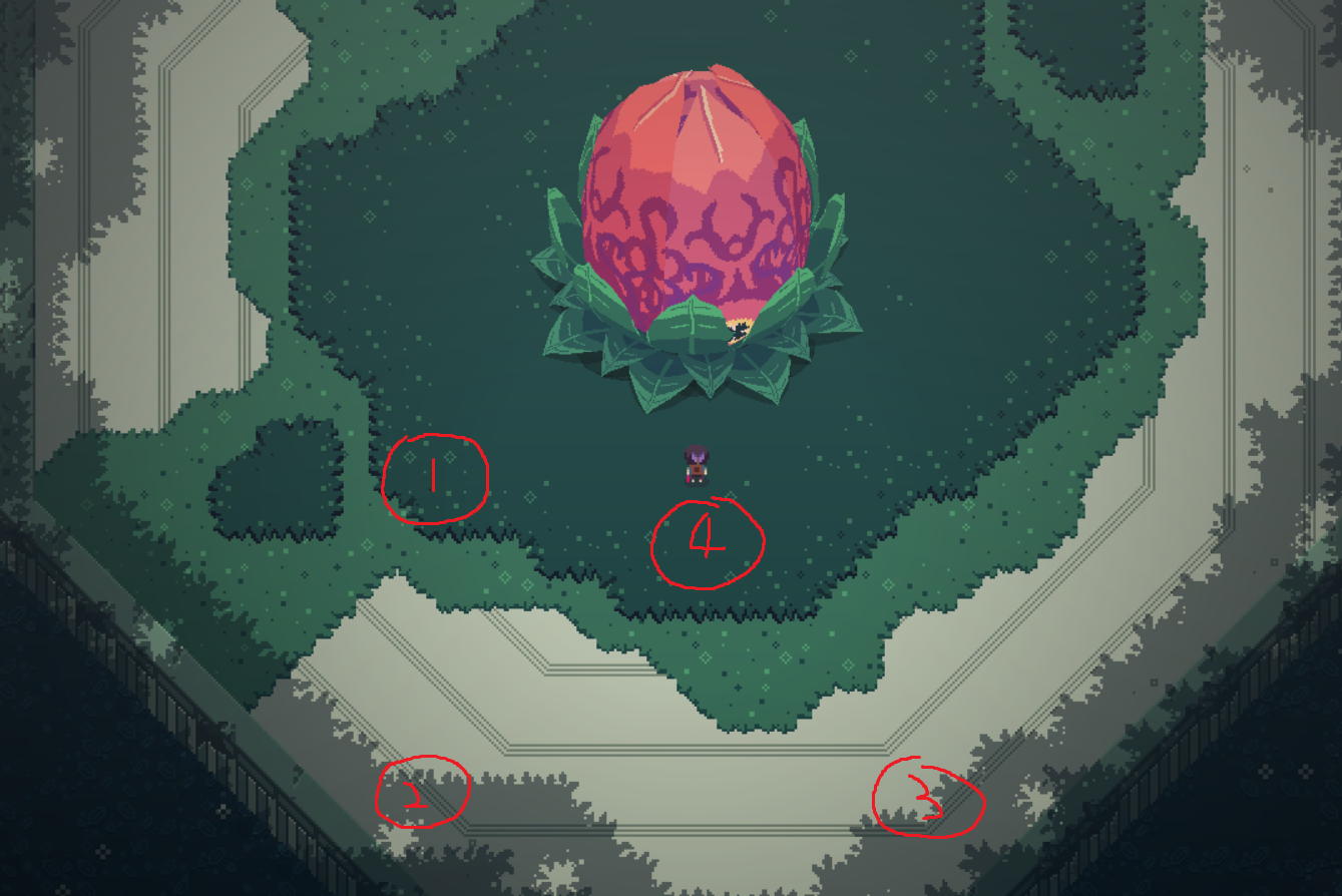 打的方法看下图中的圈,在中间激活boss,然后快速跑到圈一的位置,躲过2个藤曼,等到毒过来的时候,快速翻滚到圈二,地图的边缘,吸引毒的同时向圈三跑,等2个触手经过面前后,快速翻滚到面前(圈四),就可以射进去,赶在毒追过来的时候回收箭把花瓣拉开。