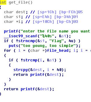 2.getfile <-输入文件名,输出内容(存在格式化字符串漏洞,顺便会把内容放在栈上)