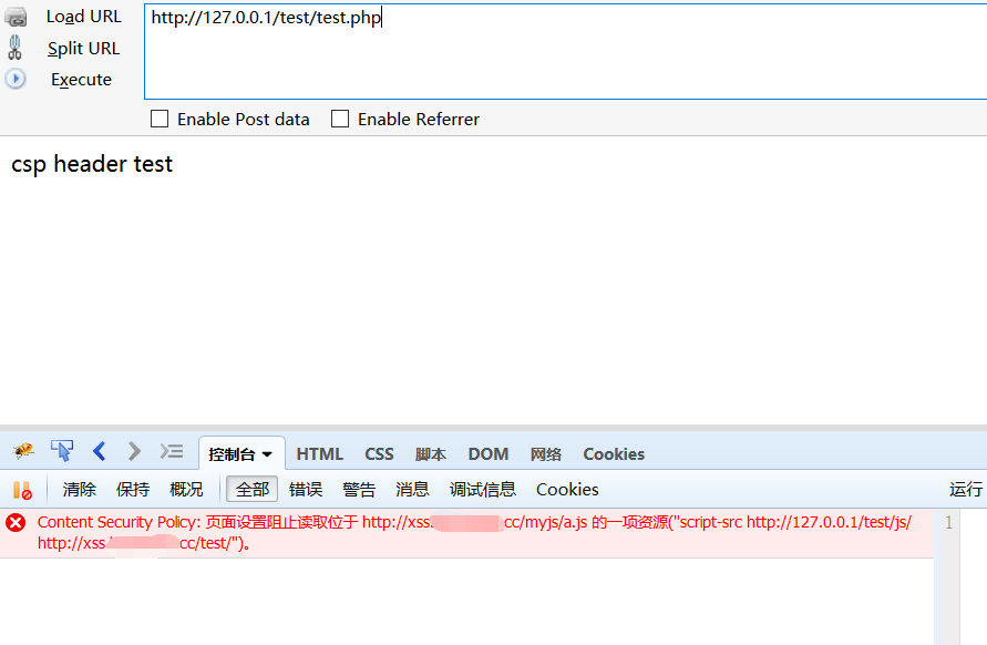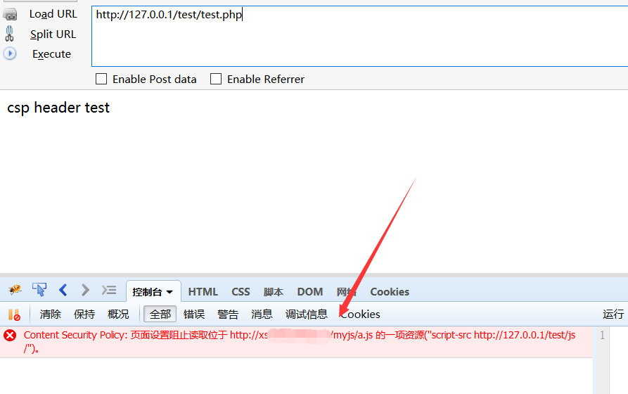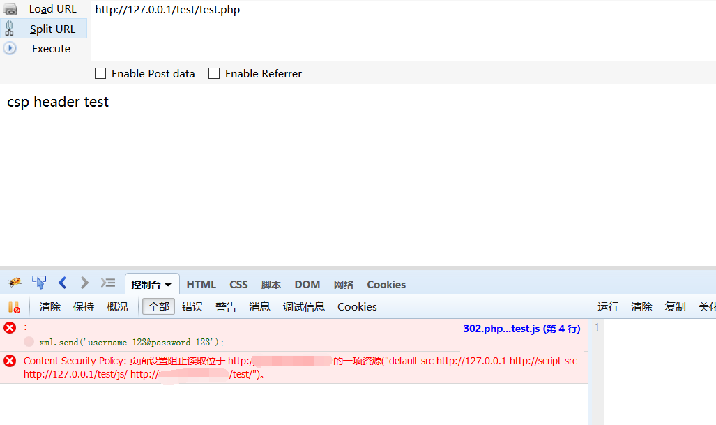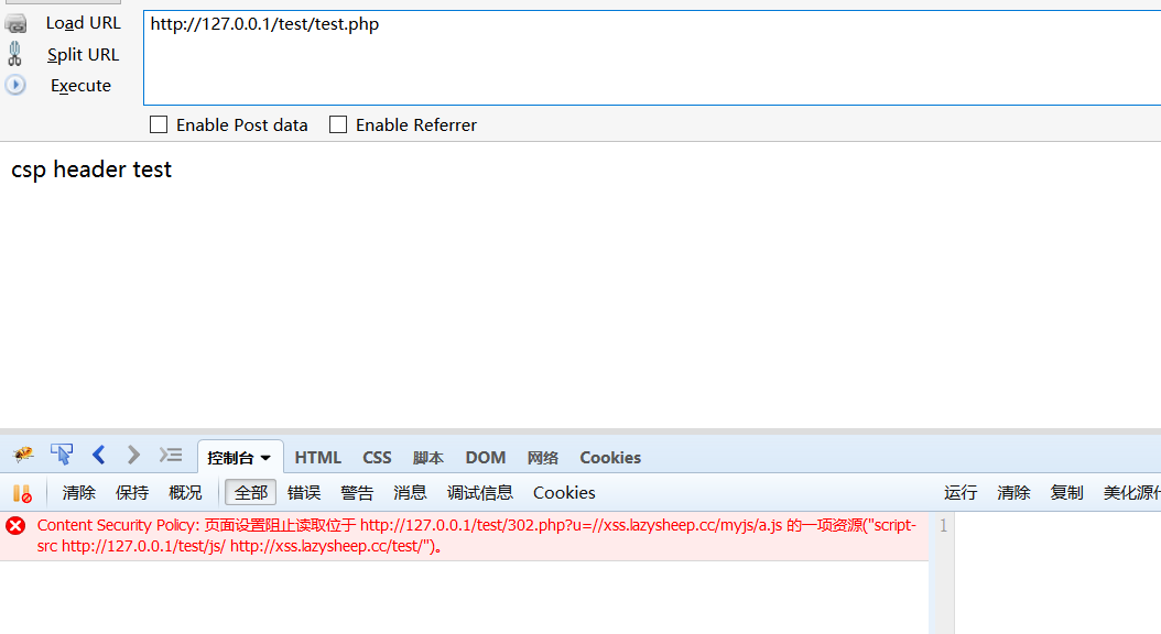 这里我们把302.php放在了站的根目录下,而我们只允许了http://127.0.0.1/test/js/和http://xss.cc/test/两个域下,很显然,302.php并不在被允许的域,结果显而易见。